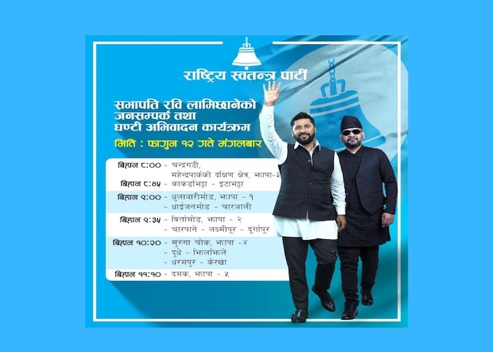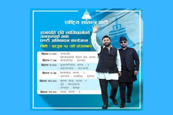 Spread the loveराष्ट्रिय स्वतन्त्र पार्टीका सभापति रवि लामिछाने र बरिष्ठ नेता तथा प्रस्तावित प्रधानमन्त्री बालेन शाह मंगलबार झापा जाने भएका छन्। उनीहरुसंगै सो क्षेत्रमा अरु नेता तथा उम्मेदवारहरु पनि चुनावी प्रचार कार्यक्रममा भाग लिन झापा जाने भएका छन। सभापति लामिछाने मंगलबार बिहान ८ बजे चन्द्रगढी, ८:४५ मा काँकडभिट्टा, ९:०० बजे धुलाबारी-रोड, ९:३० बजे बिर्तामोड, १०ः२०…