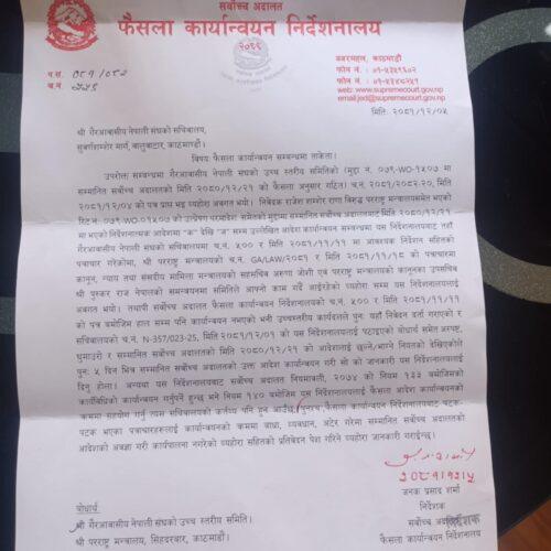 गैरआवासीय नेपाली संघ (एनआरएनए) को सचिवालयलाई सर्वोच्च अदालतको फैसला कार्यान्वयन निर्देशनालयले चेतावनीयुक्त पत्र पठाएको छ।