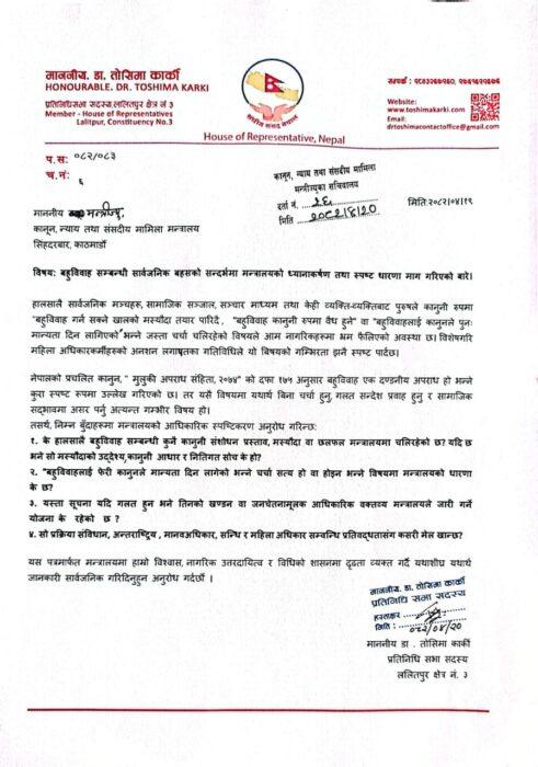 विषय: बहुविवाह सम्बन्धी सार्वजनिक बहसको सन्दर्भमा मन्त्रालयको ध्यानाकर्षण तथा स्पष्ट धारणा माग गरिएको बारे।