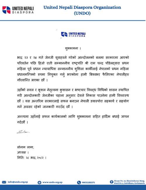 सँस्थाका सभापति सोनामलामाले प्रधानमन्त्री कार्कीको नेतृत्वको अन्तरिम सरकारको कार्यकालले समयमा नै निर्वाचन सम्पन्न गरेर राजनैतिक निकास दिन सकोस भन्ने अपेक्षा राख्दै नेपाली डायस्पोराका तर्फबाट कार्यकाल सफलको लागि शुकामना व्यक्त गरेको छ।