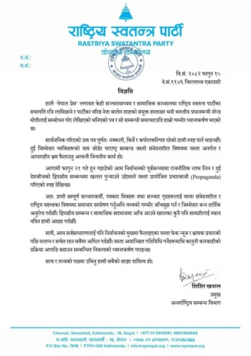 राष्ट्रिय स्वतन्त्र पार्टी (रास्वपा) ले दलका सभापति रवि लामिछाने र पार्टीका वरिष्ठ नेता बालेन शाहको संयुक्त हस्ताक्षर रहेको भनी भारतीय प्रधानमन्त्री नरेन्द्र मोदीलाई सम्बोधन गरिएको पत्रलाई ‘पूर्णतः नक्कली, किर्ते र कपोलकल्पित’ भएको कुरा विज्ञप्तिद्वारा बताएको छ।